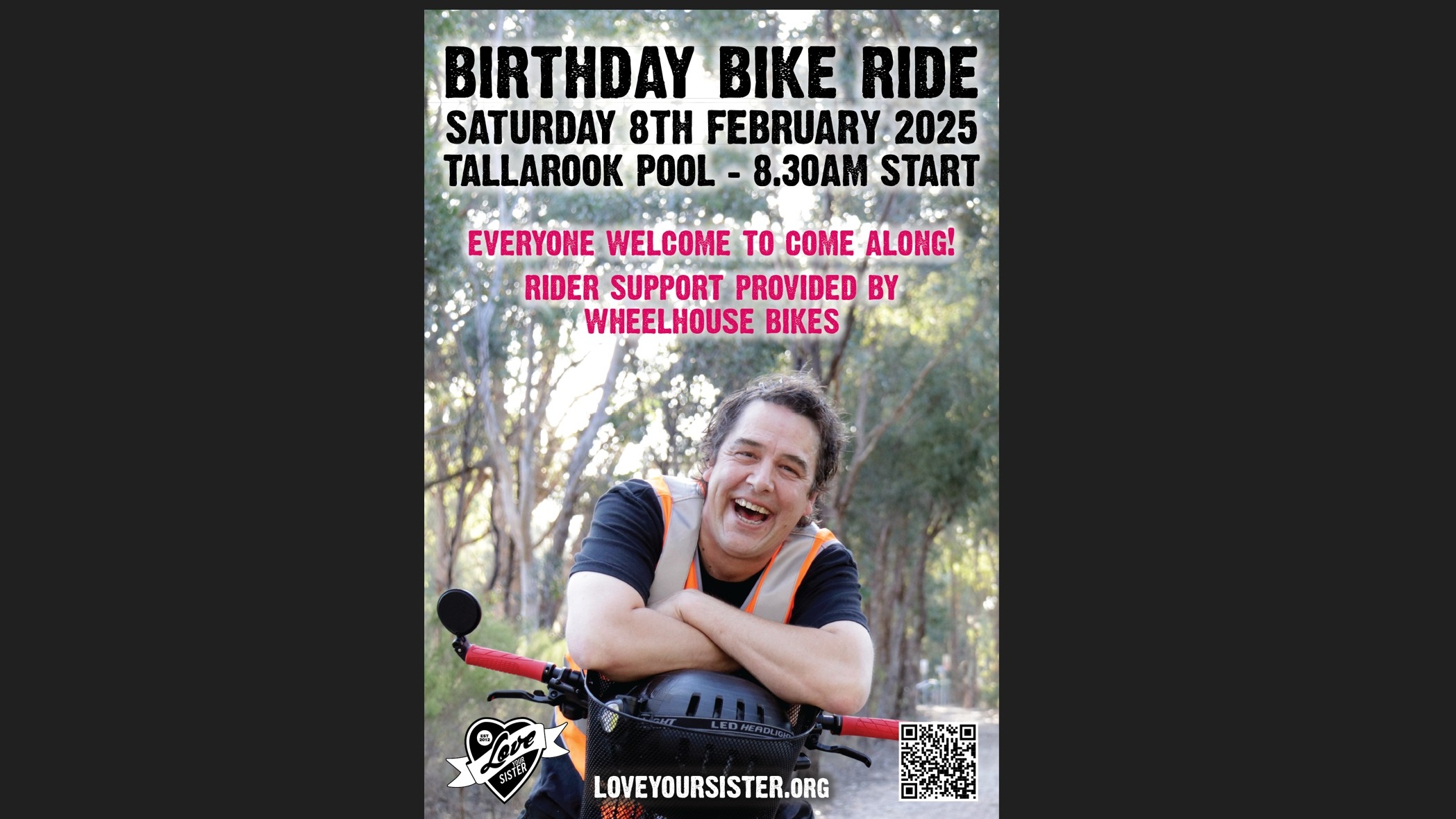 21st JAN 2025 - $42,075!!! I know what I want for my birthday! On my birthday I want to do my favourite thing. So I'm riding my bicycle along my local rail trail. 8:30am, February 8, starting at the Tallarook pool. Feel free to pedal along with me and bring your fundraising friends & family! www.facebook.com/share/1H3G6ZjQwh