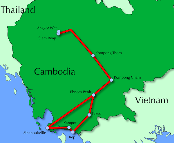 Starting in Siem Reap and visiting the famous Angkor Wat temple, before visiting two of the five primary schools supported by the Children of Cambodia Foundation in the Phum O district, the tour winds its way through 550km of Cambodian countryside over 12 days before finishing up at Sihanoukville.