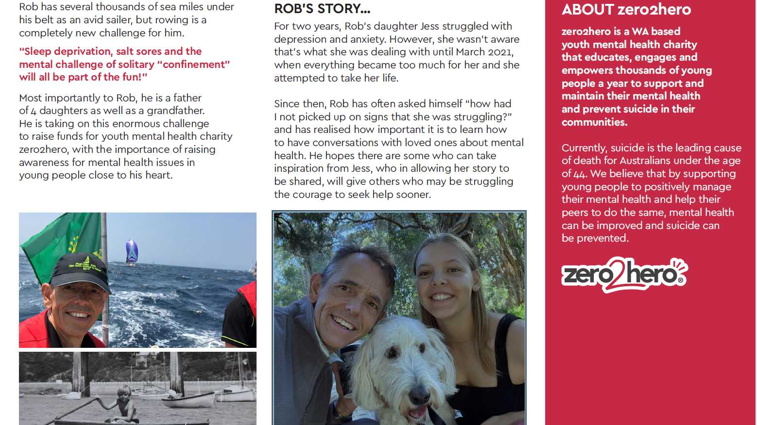 zero2hero is a WA-based youth mental health charity that educates, engages and empowers thousands of young people a year to support and maintain their mental health and prevent suicide in their communities.