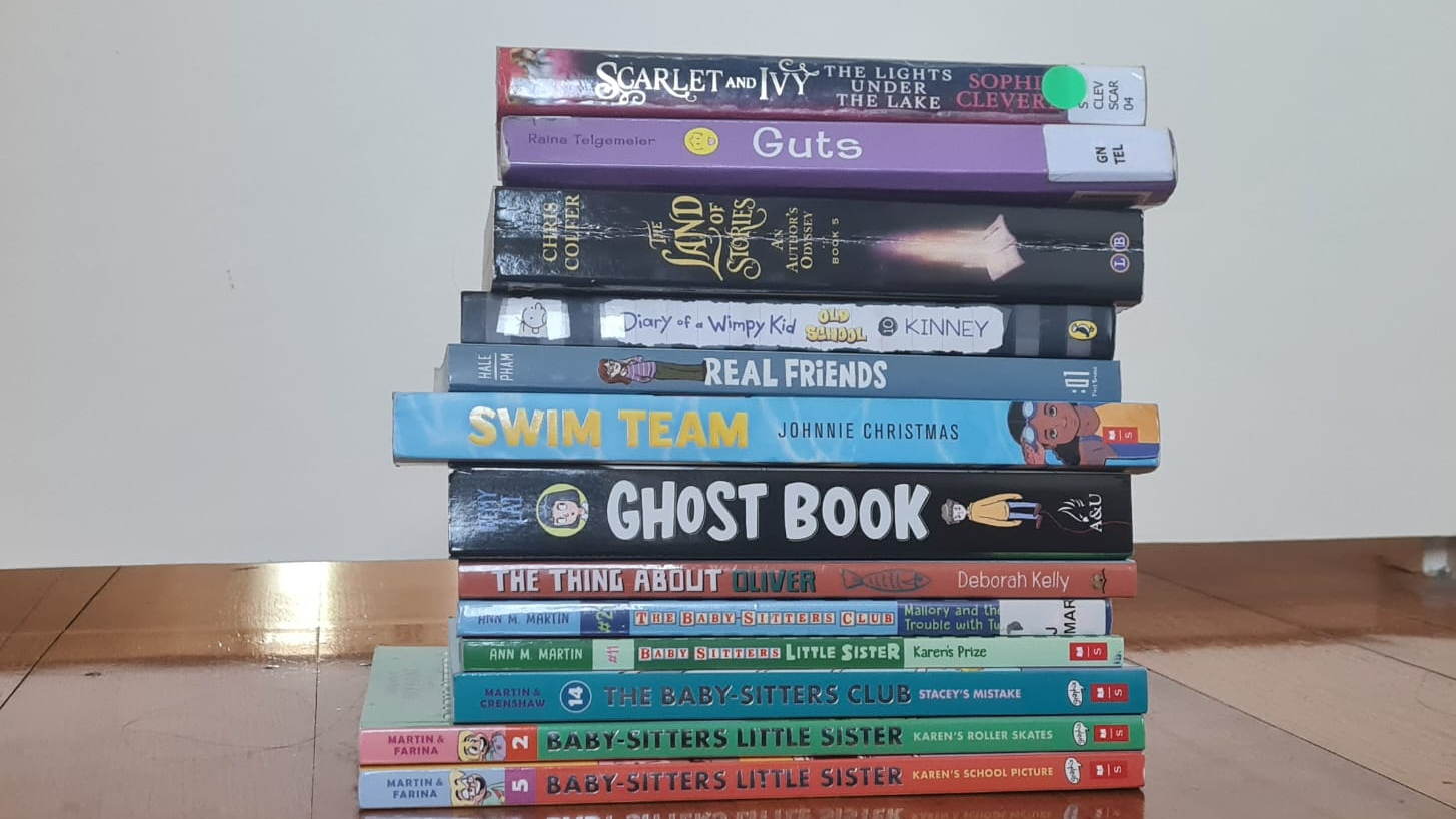 Hi everyone! Thank you to everyone who have donated so far. Please share this with more people! From Anjali Books I Have Read Key-GN=Graphic Novel The babysitters little sister- Karen’s Prize The Guggenheim Mystery Best Friends(GN) Amulet- Book Two(GN) Guts(GN) Scarlet and Ivy- the lights under the lake The Land Of Stories- Book 5 Diary Of a wimpy kid-book 10 Real Friends(GN) Swim Team(GN) Ghost Book(GN) The thing about Oliver The baby sitters club- Book 21 The baby sitters club-book 14(GN) The baby sitters little sister-book 2(GN) The baby sitters club little sister-book 5(GN)