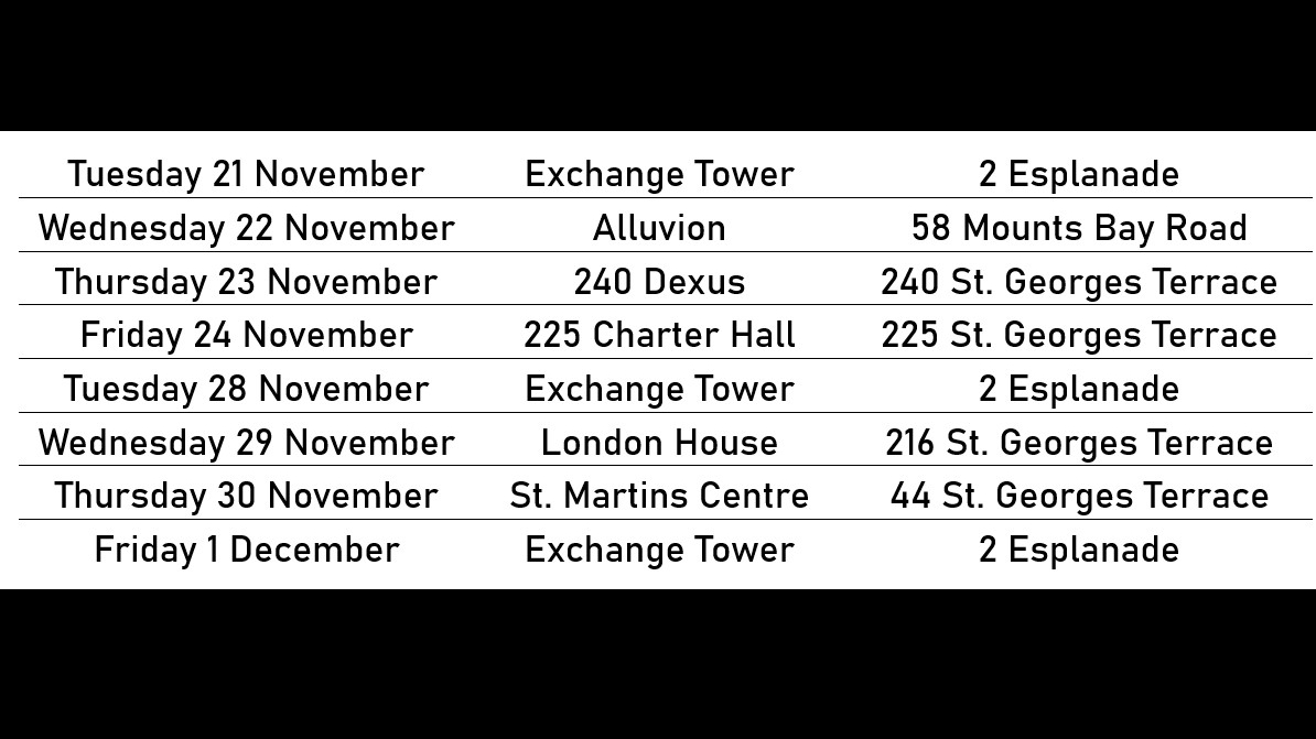 Motivate Ultra's 2023 Charity Spin Roadshow event returns for its 9th consecutive year for what will be our biggest ever event. Held from 21 November through to 1 December moving between multiple buildings along St Georges Terrace across the two weeks.