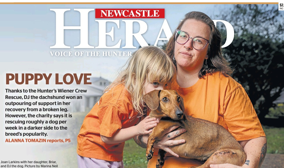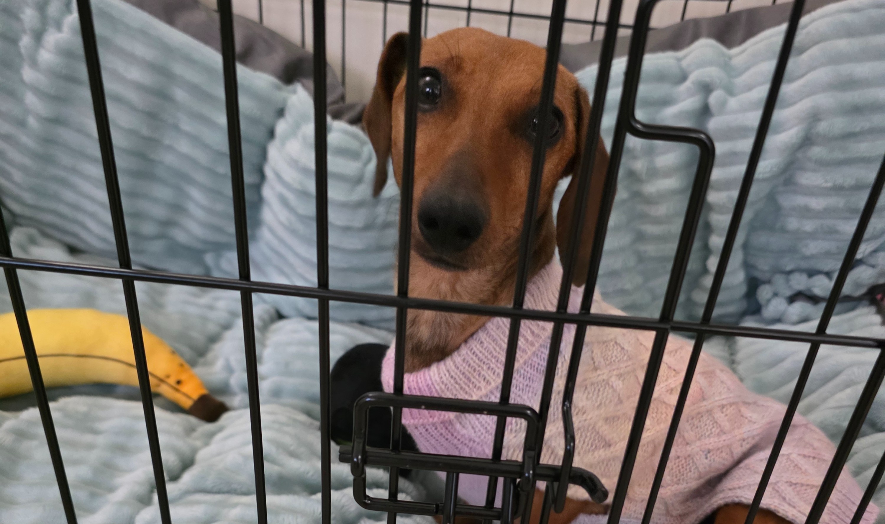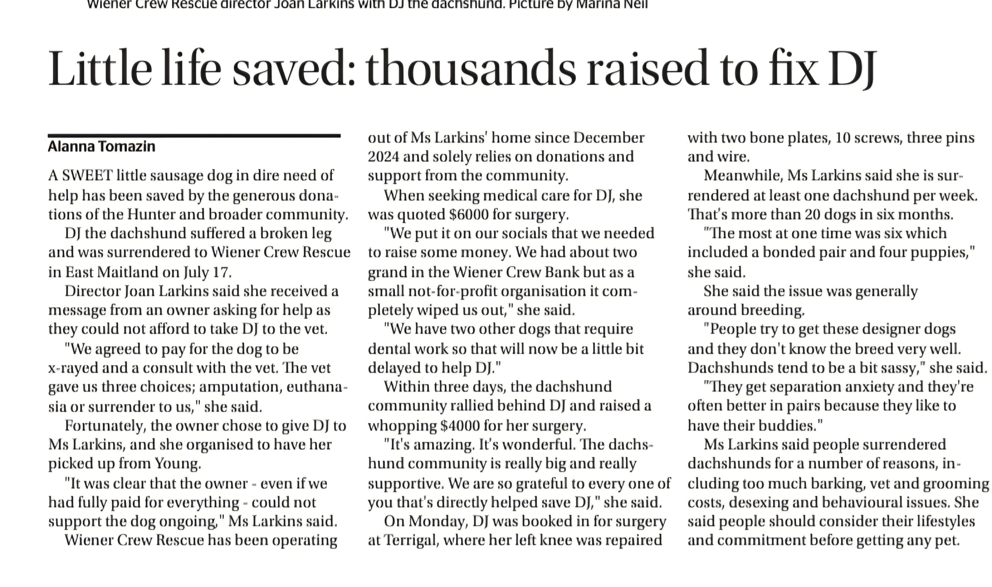 DJ the sausage dog has gotten into an accident and has broken a leg. Het owner is unable to pay for her vet fees to fix it, so she's been taken into the care of Wiener Crew Rescue.